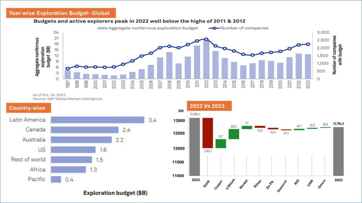Overall Decline: The year 2023 witnessed a notable decrease in the overall global exploration budget, particularly in gold, which saw a significant dip. This reduction can be attributed to factors such as falling gold prices and investor caution.
